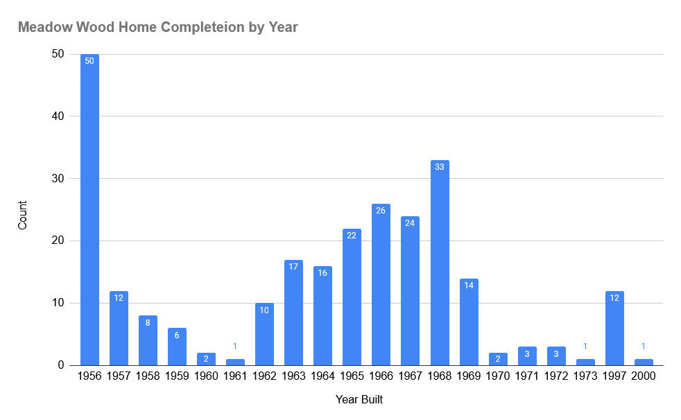 Home building in Meadow Wood tapered off into the early 1960s, until a significant building boom occurred, starting in 1962. During the period of 1962-1969, 162 homes were completed in the subdivision. The final 21 homes in the Meadow Wood subdivision were completed between 1970 and 1973.